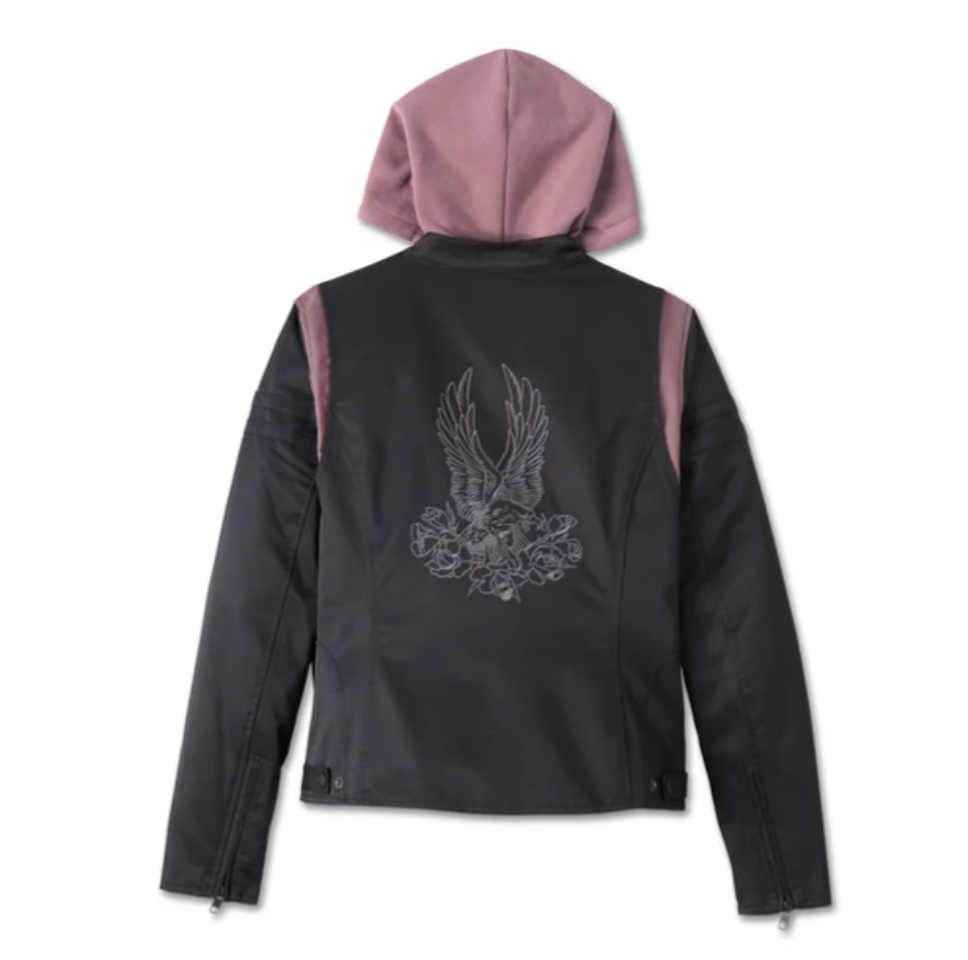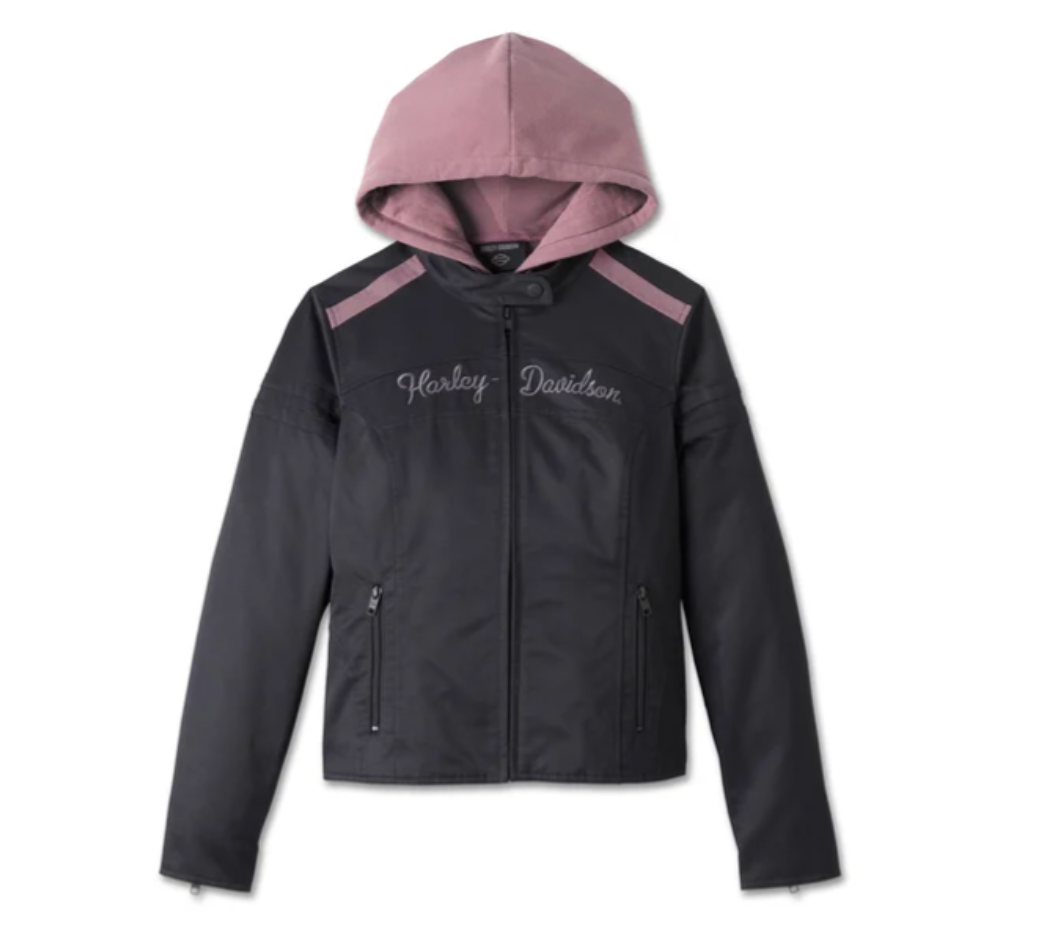 • Additional Features: Detalles de diseño: La chaqueta tiene rayas en las mangas aplicadas en la parte superior, piezas de contraste en los hombros delanteros y en la parte trasera dinámica, costuras princesa, costuras en las caderas, cuello con lengüeta a presión y cintura ajustable con lengüeta a presión. La sudadera con capucha extraíble tiene una capucha con cordón de ajuste forrada de jersey con aglets metálicos, cremallera frontal y puños y dobladillo de punto elástico.