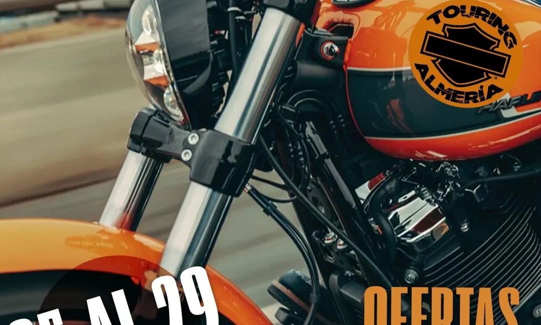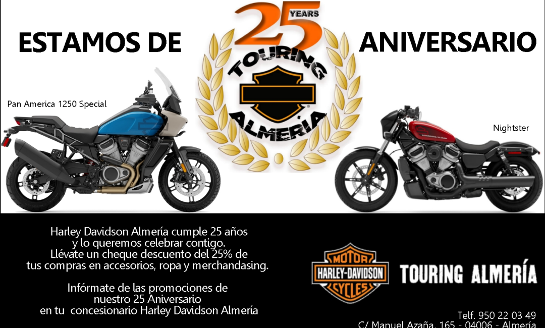 Touring Almería cumple 25 años de servicio, y lo celebramos ¡a lo grande!. Por eso, hasta el 31 de diciembre de 2022, puedes disfrutar del 25% de descuento en ropa, accesorios, merchandising en stock en nuestras instalaciones, y también condiciones especiales en la compra de tu Harley-Davidson. ¡Celebremos juntos este