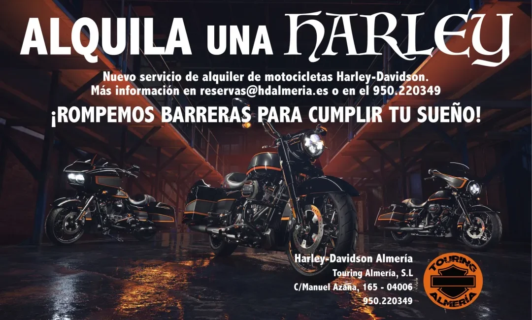 Nuevo servicio de alquiler de motocicletas Harley-Davidson en tu concesionario Touring Almería. Ahora, puedes alquilar una Harley y sentir el poder de su conducción. ¡Rompemos barreras para cumplir tu sueño! Más información en reservas@hdalmeria.es o llamando al teléfono 950 220349.